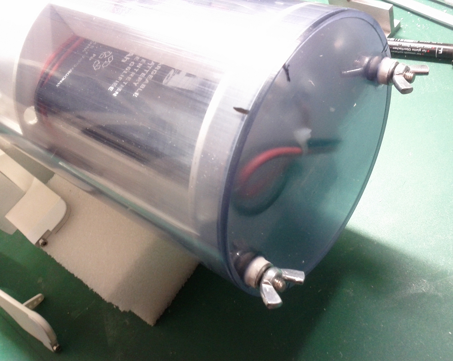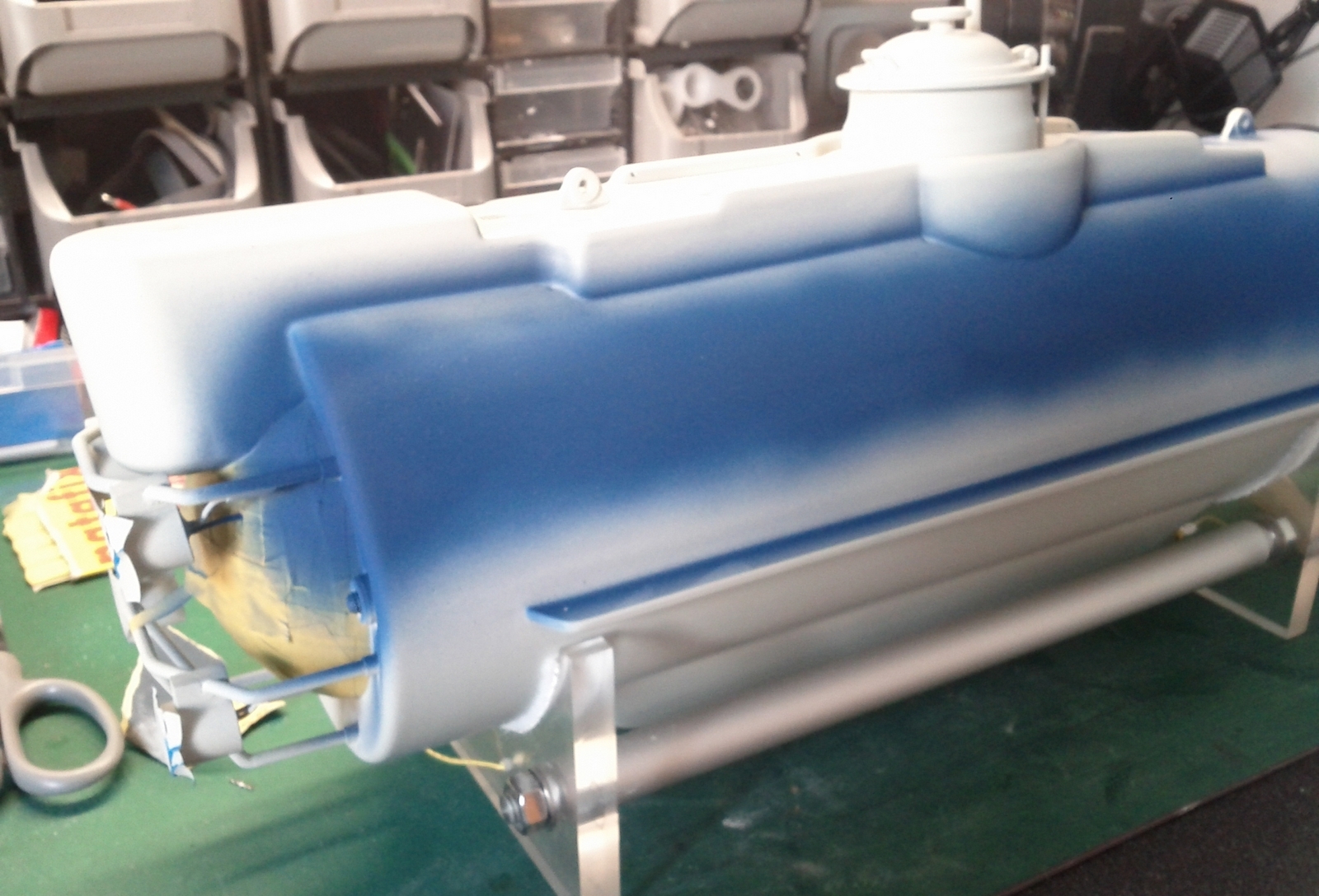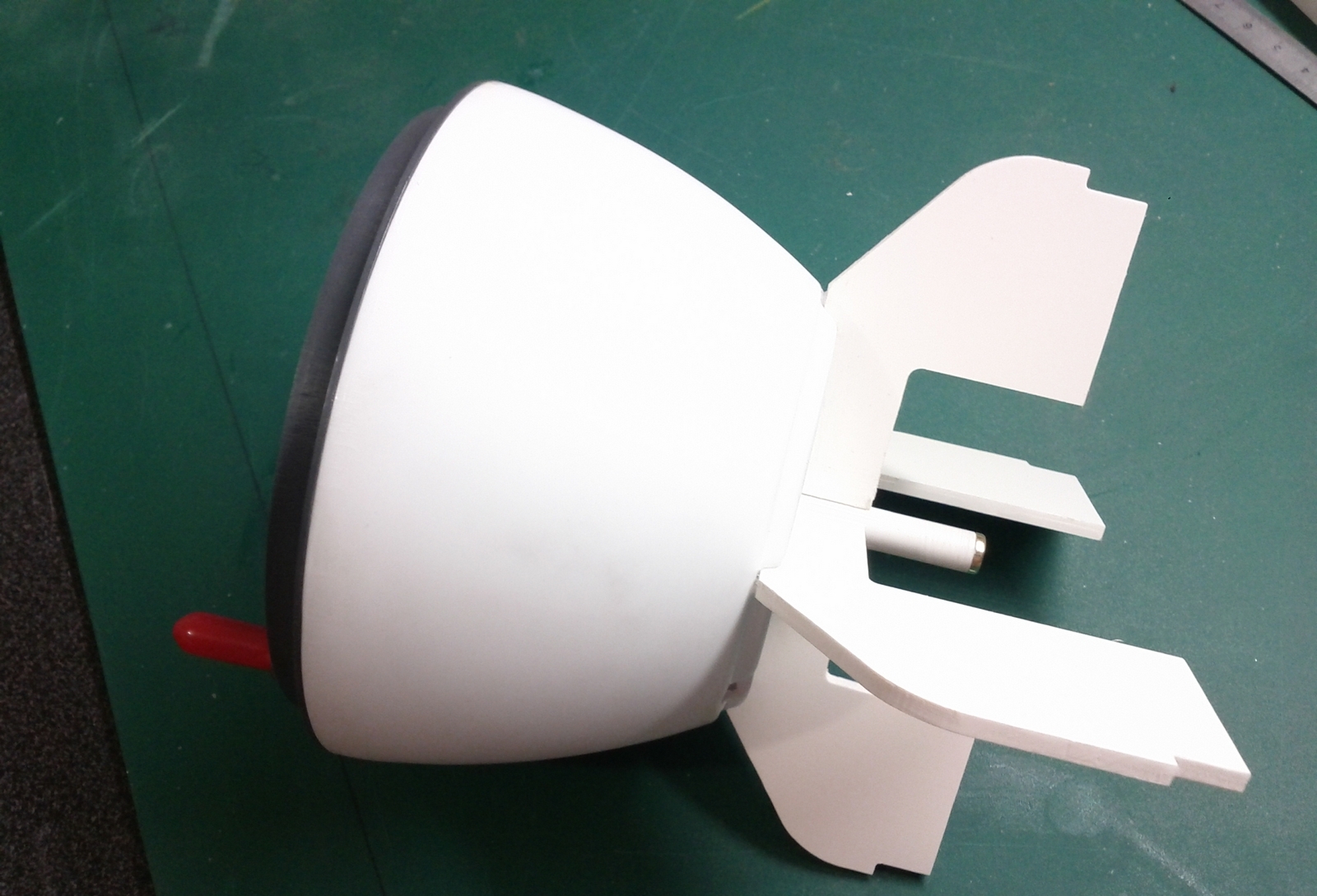 L'autre modification porte sur la fixation platine / cône de propulsion, en effet lors des premiers essais d'étanchéité, j'ai eu la désagréable surprise d'un décollement de ces deux parties, j'ai donc renforcer cette partie en y ajoutant des pièces en plexi de 10mm d'épaisseur sur les deux faces de la platine, ce qui accroît la surface de collage de l'ensemble permettant une meilleure résistance à la traction provoquée par les tiges de serrages.